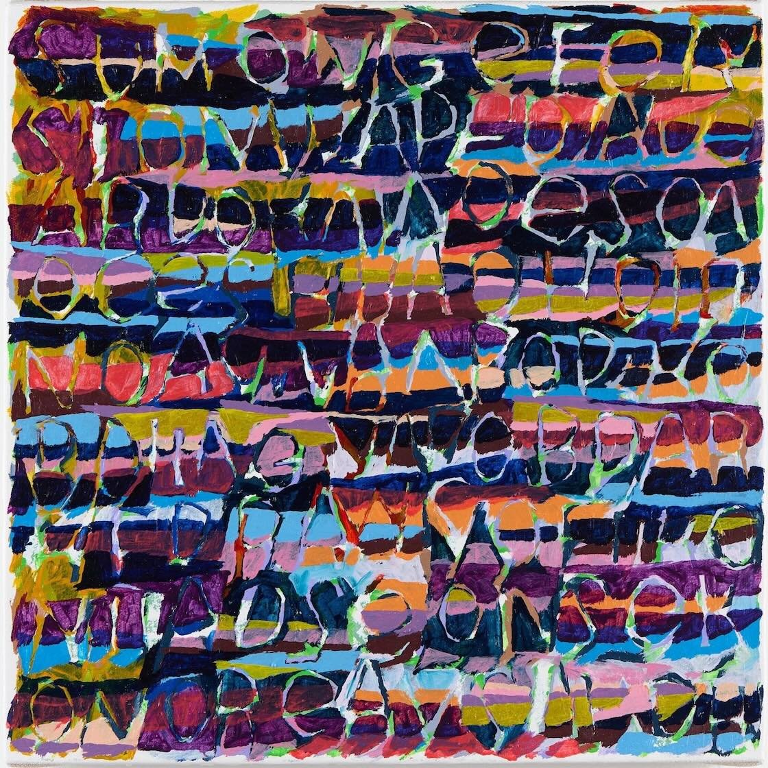Joshua Rampage is a collector of real secrets and in his paintings, he obscures these private affairs under layers of paint. As a color-blind artist, Rampage's process is geared towards organic compositions juxtaposed with geometric foundations. Even with his unique perspective, his color usage forms balanced work that folds in his affinity to art history, especially Allover paintings popularized in the mid 20th century. Rampage submits to the power of chance, allowing each layer to build out the composition in between the text and arriving at the final stage through improvisation.