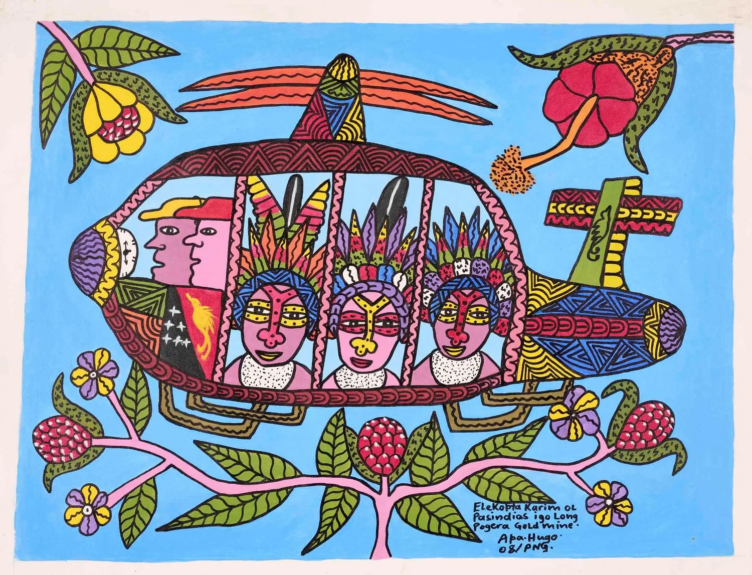 Mathias Kauage (ca. 1944–2003) is acclaimed for his boldly colorful paintings of a world radically changing around him in the late 20th century. This exhibition features four paintings from our collection by Mathias and his family, on view for the first time. During his lifetime, Mathias experienced dramatic societal shifts — not only during the decades under colonial Australian administration but also after Papua New Guinea achieved independence in 1975. Both periods are a focus of his work. In the late 1970s, Mathias and later his wife, Elizabeth (Elisabet), led the contemporary arts movement in the newly independent country, which explored nationhood and technological advancement. Later works also addressed issues such as the onset of the HIV/AIDS epidemic. The circle of artists working in their style grew to encompass their children, including a nephew and adopted son Apa Hugo. They, along with Elizabeth, continue their father’s artistic legacy today as professional painters.