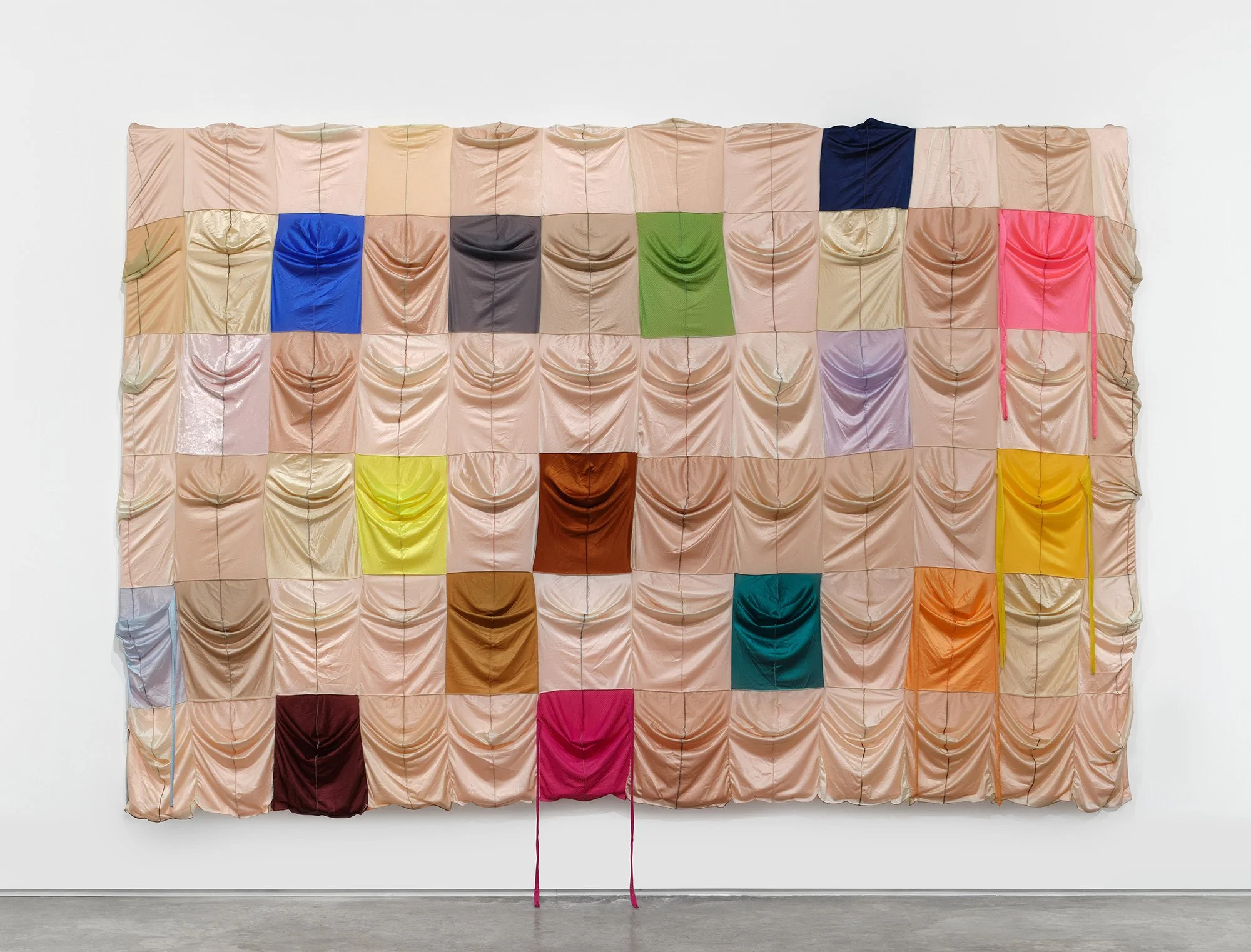 Image credit: Anthony Olubunmi Akinbola Untitled/Singing Bird, 2025, durags on wooden panel, 80 1/4 x 146 1/2 in (204 x 372 cm); courtesy of the artist and Night Gallery, Los Angeles. Photography by Nik Massey.