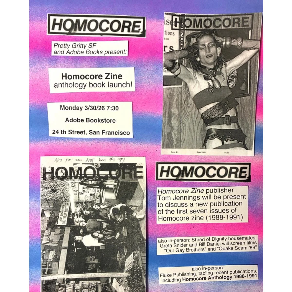 Join Adobe Books for the Homocore Zine anthology book launch as Tom Jennings will be presenting the new publication as well as a screening of “Our Gay Brothers” and “Quake Scam ‘89” courtesy of Bill Daniel and Greta Snider.