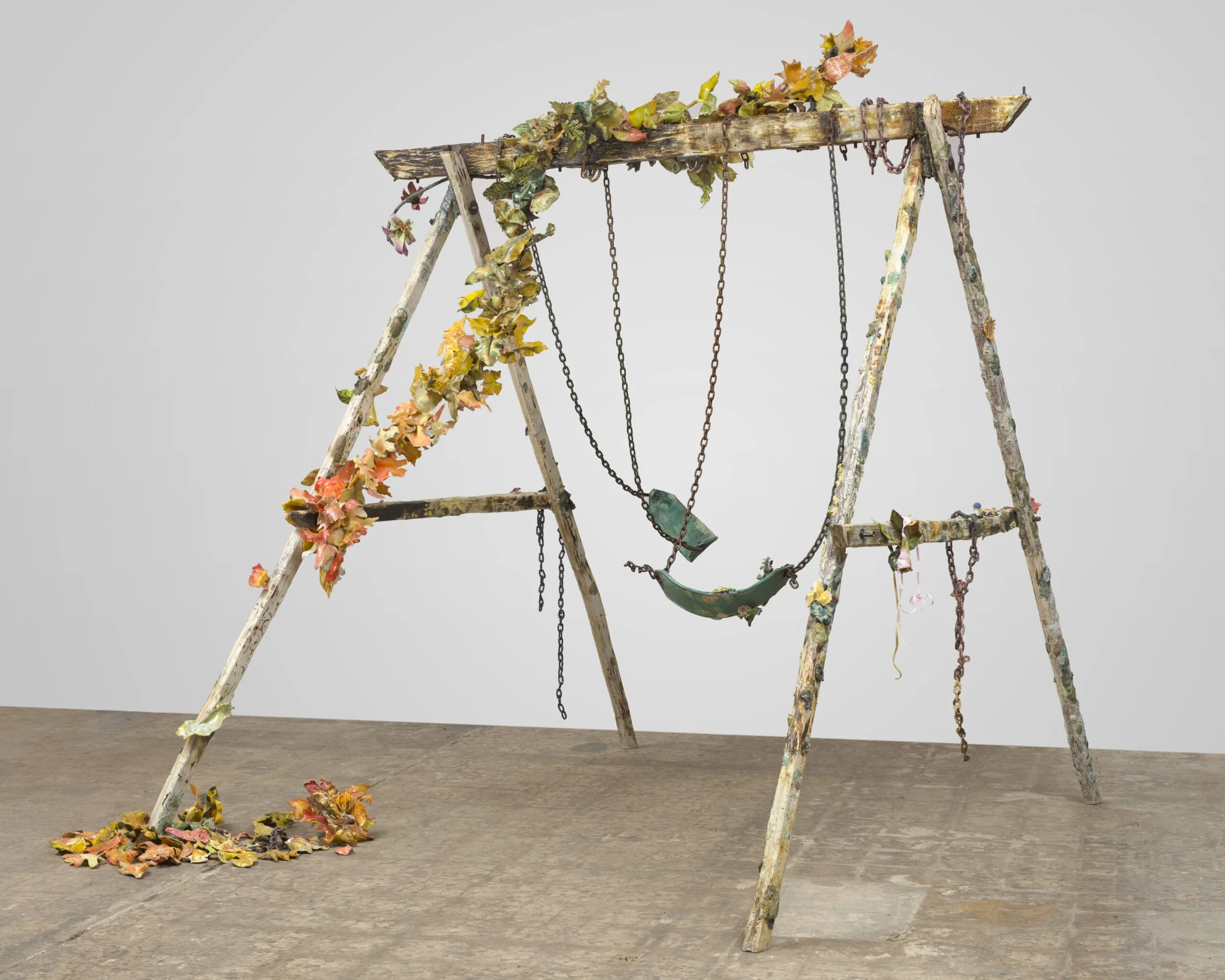 At the center of the exhibition is Nightsnack (2022–2025), an eight-by-eight-foot trompe-l’œil construction made of ceramic and glass. Modeled after Manson’s childhood swing set, its porcelain posts mimic worn lichen-covered wood. An uncannily realistic bag litters a pile of ceramic leaves, while a glass bikini hangs nearby. Both playful and elegiac, the joys of youth and freedom feel tangible but slippery, as if on the brink of expiration.