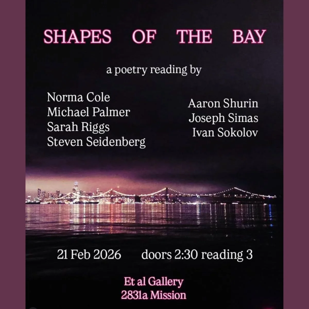 SHAPES OF THE BAY a poetry reading by: Norma Cole, Michael Palmer, Sarah Riggs, Steven Seidenberg, Aaron Shurin, Joseph Simas, Ivan Sokolov.