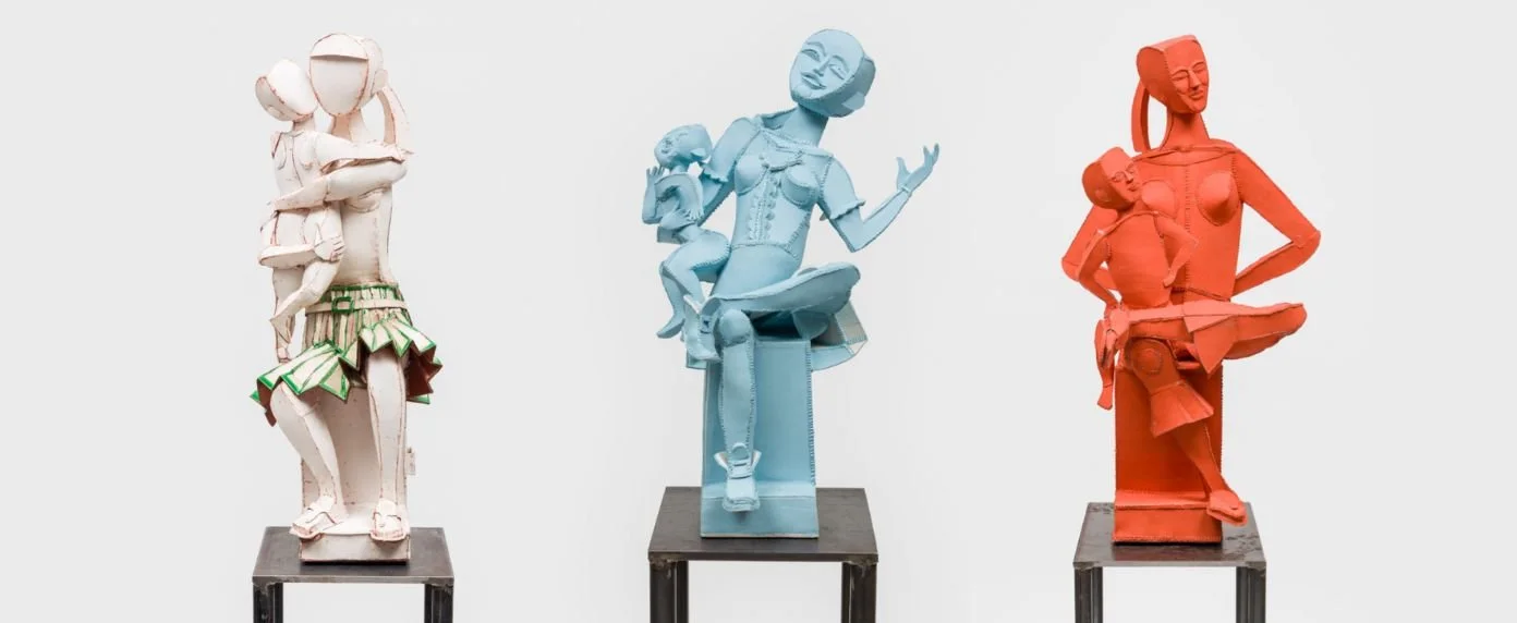 Three pairs of women—each presumably a mother and child (clearly daughters here)—all some variant of fired clay, sit on boot-shaped thrones, resting on felt, on steel pedestals. One, Red Hot Hands on Hips, Madonna, burns a bright cadmium red, like some anti-Judd that still adheres to his laconic idea that, in art, "a work needs only to be interesting." And how. In another, Green Pleated Skirt Madonna in glazed white earthenware, the pair of faceless figures recall early 20th-century, mostly French, precedents: the lines of Matisse's dancers of 1910 with a kind of Duchampian send-up of cubism on a staircase.